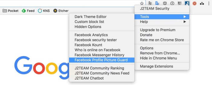 J2TEAM Security là tiện ích bảo vệ bạn khỏi những trang web lừa đảo đánh cắp tài khoản, mã độc... Khi cài đặt hoàn tất, bạn chỉ cần nhấn phải chuột vào biểu tượng của tiện ích ở góc phải trình duyệt và chọn Tools (công cụ) > Facebook Profile Picture Guard (bảo vệ hình ảnh đại diện Facebook).