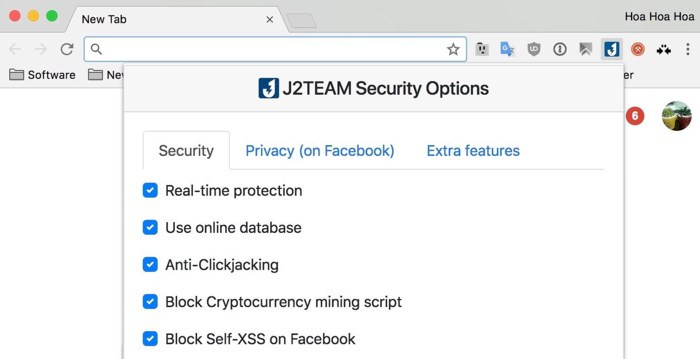 Bên cạnh đó, J2TEAM Security còn giúp ngăn chặn các vấn nạn lừa đảo, mất cắp tài khoản trên Facebook. Để sử dụng, bạn chỉ cần kích hoạt tùy chọn Real-time protection (Bảo vệ theo thời gian thực), Use online database (Sử dụng cơ sở dữ liệu online), Anti-Clickjacking (Chặn Clickjacking), Block Self-XSS on Facebook (Chặn Self-XSS trên Facebook).