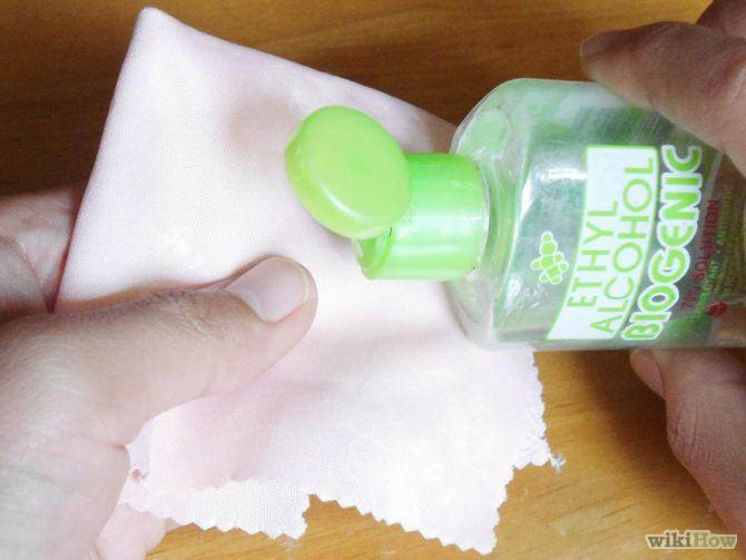- • Dampen vải và đổ một số (đọc một giọt hoặc hai) tay rửa gel vào nó. Nếu bạn đang sử dụng một xà phòng, chà nó một chút trên một góc của miếng vải ẩm.