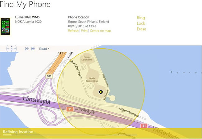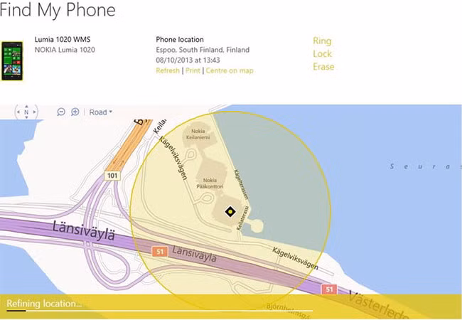 Nếu bạn không nhớ mình đã để điện thoại ở đâu, bạn cũng có thể khôi phục nó bằng sự trợ giúp của dịch vụ tích hợp của Microsoft. Công ty đã xây dựng một tính năng tìm điện thoại bị mất trực tiếp vào Windows Phone 8.1, cho phép bạn dễ dàng tìm thấy vị trí của điện thoại hoặc kích hoạt chuông điện thoại từ xa. Nó không yêu cầu cấu hình bổ sung sau khi bạn thêm tài khoản Microsoft, mặc dù nó sẽ chỉ hoạt động nếu thiết bị của bạn có pin và được kết nối với internet.