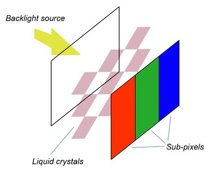 Trước hết chúng ta sẽ tìm hiểu một chút về cơ chế hoạt động của màn hình LCD. Để hiển thị được màu sắc, màn hình LCD sẽ sử dụng đền nền (LED/CCFL) chiếu ánh sáng trắng qua lớp tinh thể lỏng (LCD) và thông qua tấm lọc để tạo màu 3 màu cơ bản. 3 màu cơ bản này sẽ thay đổi cường độ nhằm tạo ra màu sắc hiển thị cuối cùng. Nhiệm vụ thay đổi cường độ của màu sắc là chính là do lớp tinh thể lỏng đảm nhiệm, tuỳ theo cường độ mong muốn mà nó có thể không chặn, chặn một phần hoặc chặn tất cả ánh sáng đi qua.