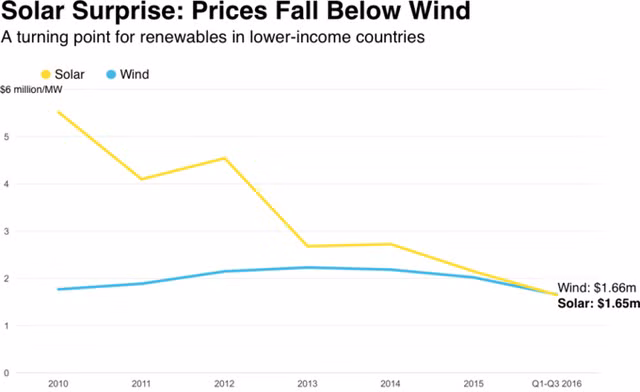 Biểu đồ dưới đây cho thấy chi phí trung bình của các dự án điện gió và mặt trời mới được xây dựng tại 58 quốc gia đang phát triển, bao gồm Trung Quốc, Ấn Độ và Brazil. Không ai nghĩ rằng điện mặt trời có thể rẻ hơn điện gió sớm đến vậy.