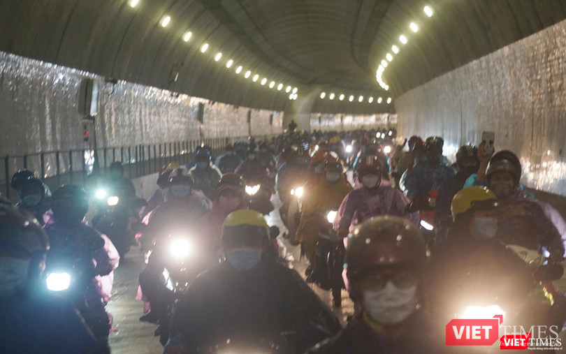 | Tất cả các phương tiện đi qua hầm Hải Vân được điều tiết tạm dừng lưu thông để phục vụ đoàn người đi xe máy về quê |