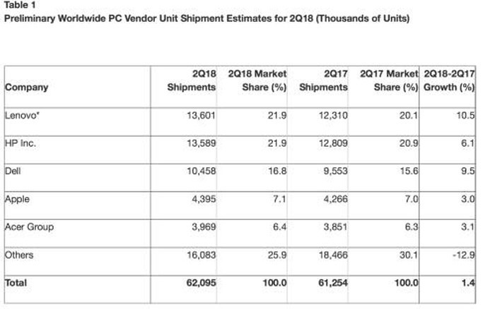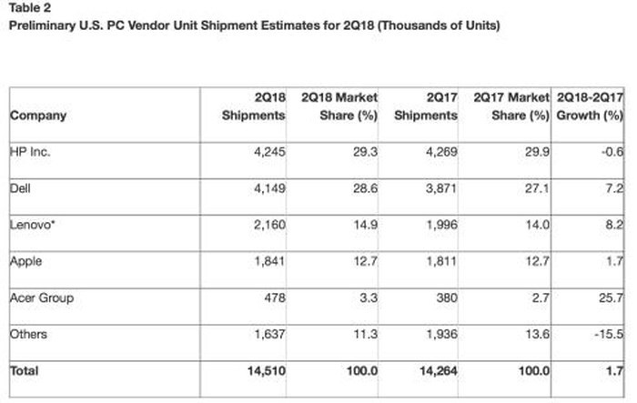 Hãng sản xuất PC Lenovo của Trung Quốc và HP của Mỹ vẫn là hai cái tên "đình đám" nhất trên thị trường PC thế giới với thị phần đều đạt 21,9%, xếp sau đó là Dell với 16,8% và Apple với 7,1%. Hãng Acer đứng cuối bảng top 5 hãng PC đạt doanh số cao nhất trong quý 2/2018 với gần 4 triệu chiếc và thị phần 6,4%.