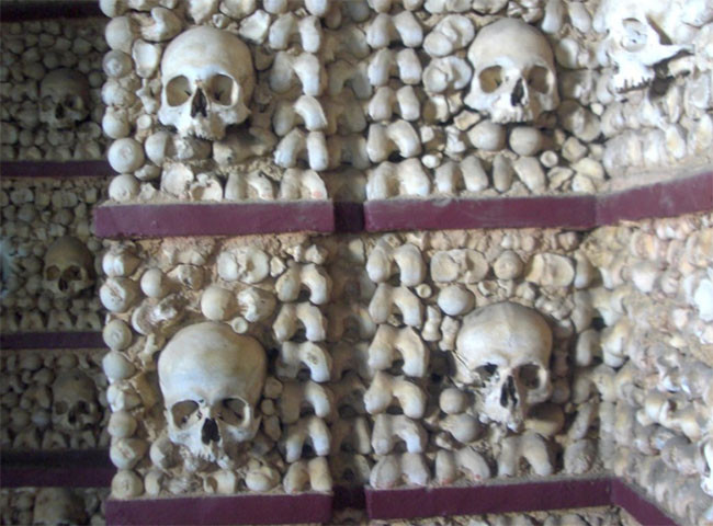 Được xây dựng vào thế kỷ 16 bởi một tu sĩ dòng Phanxicô, người muốn truyền tải thông điệp "mori memento" - một cụm từ Latinh có nghĩa là "nhớ bạn sẽ chết" - Capela dos Ossos chứa gần 5.000 bộ xương người đến từ các nghĩa trang gần đó. Nhà thờ này cũng bao gồm hai xác chết được treo trên tường bằng dây xích, một trong số là một đứa trẻ.