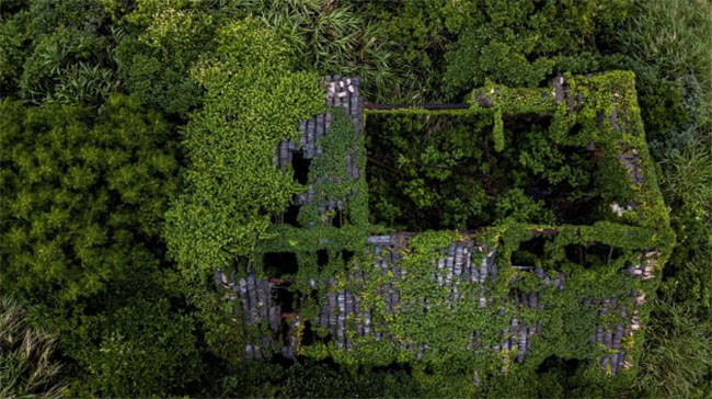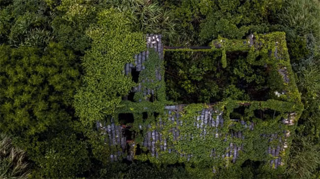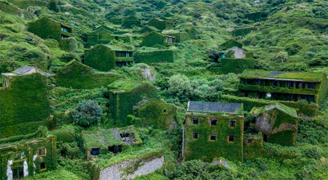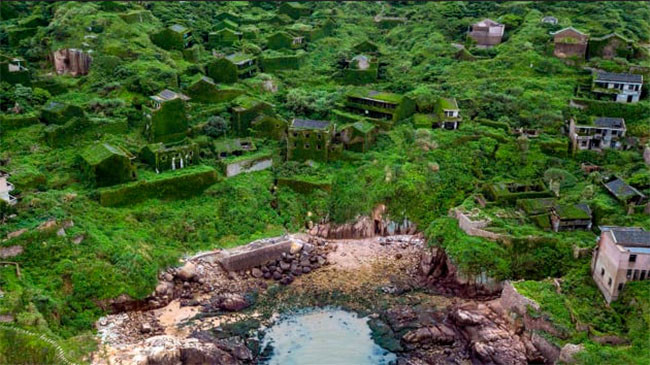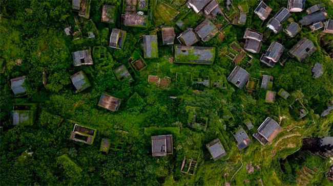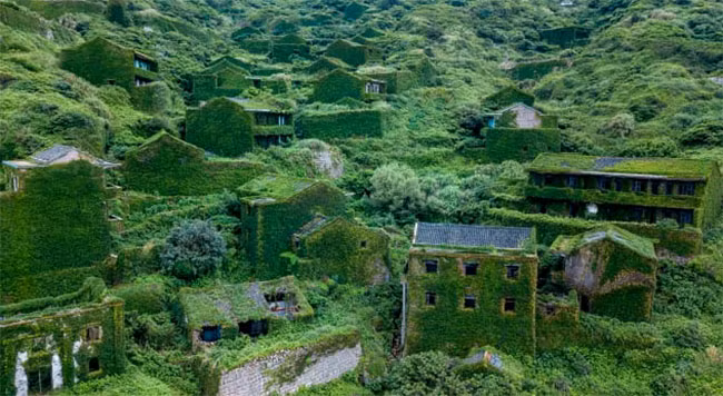 Sau nhiều thập kỷ bị bỏ hoang, những căn nhà trống hướng biển, ngôi làng ở bên vách đá vẫn tồn tại và được cây leo che phủ một màu xanh tươi.