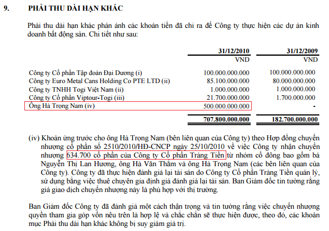 Báo cáo tài chính 2010 của OCH đã lần đầu ghi nhận một khoản phải thu dài hạn trị giá tới… 500 tỷ đồng liên quan đến cá nhân ông Hà Trọng Nam. Theo đó, khoản tiền nửa nghìn tỷ này được OCH giải thích là khoản ứng trước cho ông Hà Trọng Nam theo Hợp đồng chuyển nhượng cổ phần số 2510/2010/HĐ-CNCP ngày 25/10/2010 về việc Công ty nhận chuyển nhượng 634.700 cổ phần của Công ty Cổ phần Tràng Tiền từ nhóm cổ đông bao gồm bà Nguyễn Thị Lan Hương, ông Hà Văn Thắm và ông Hà Trọng Nam.