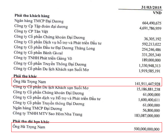 Tổng cộng, tính đến cuối Quý I/2015, ông Hà Trọng Nam vẫn mang trên mình một nghĩa vụ trả nợ rất lớn, lên đến 642 tỷ đồng đối với Công ty cổ phần Khách sạn và Dịch vụ Đại Dương,.