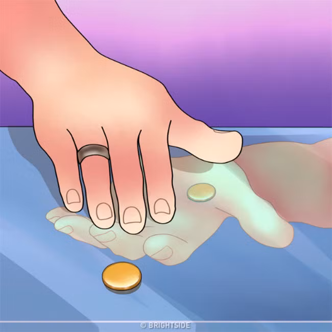 Cách thực hiện: Các nhà ảo thuật sử dụng 2 đồng tiền xu giống hệt nhau cho thủ thuật này. Một trong những đồng tiền được đặt trên kính trong khi một cái khác vẫn ẩn trong lòng bàn tay của pháp sư. Một phụ kiện thiết yếu của thủ thuật này là một chiếc nhẫn với một nam châm gắn liền với nó vẫn ẩn bên dưới ngón tay của pháp sư.