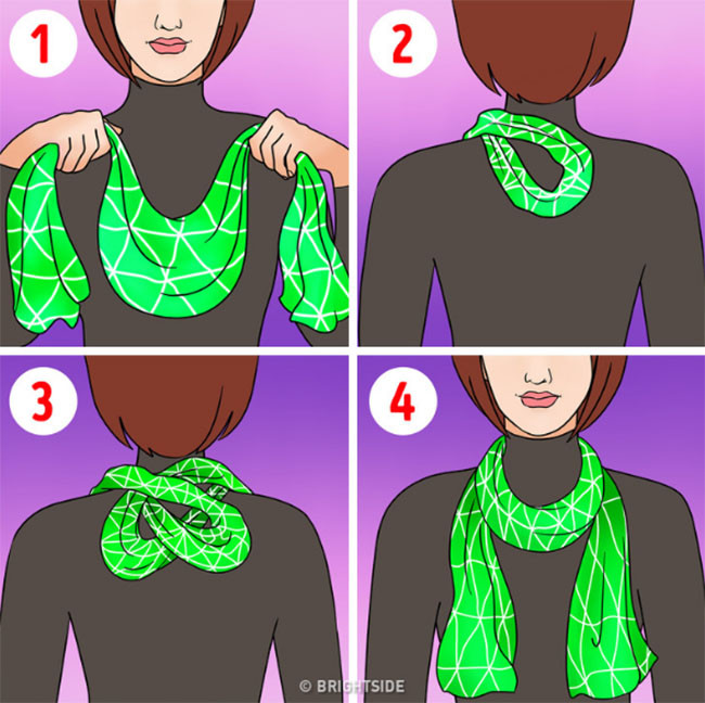 Cách thực hiện: Đây là một mẹo khác khá dễ làm ở nhà. Tất cả những gì bạn cần là một chiếc khăn dài hoặc một sợi dây thừng. Cuốn khăn theo các hướng dẫn trong hình trên. Bạn cần phải tạo ra 2 vòng lỏng lẻo và kéo một cái qua cái kia.