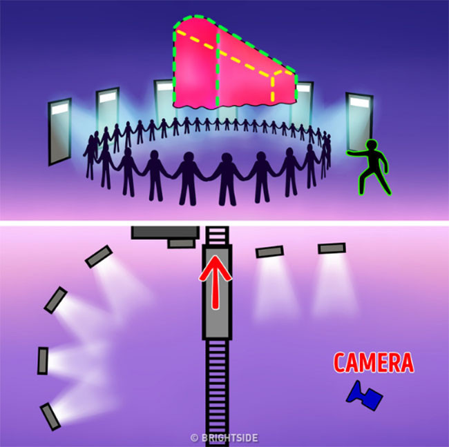 Mục đích của đèn pha mạnh mẽ không chỉ là tạo ra một bầu không khí huyền diệu - chức năng chính của chúng là làm sao lãng sự chú ý của khán giả và khiến họ tập trung vào khung bằng vải trong khi xe ngựa bị kéo đi mà không hề hay biết.