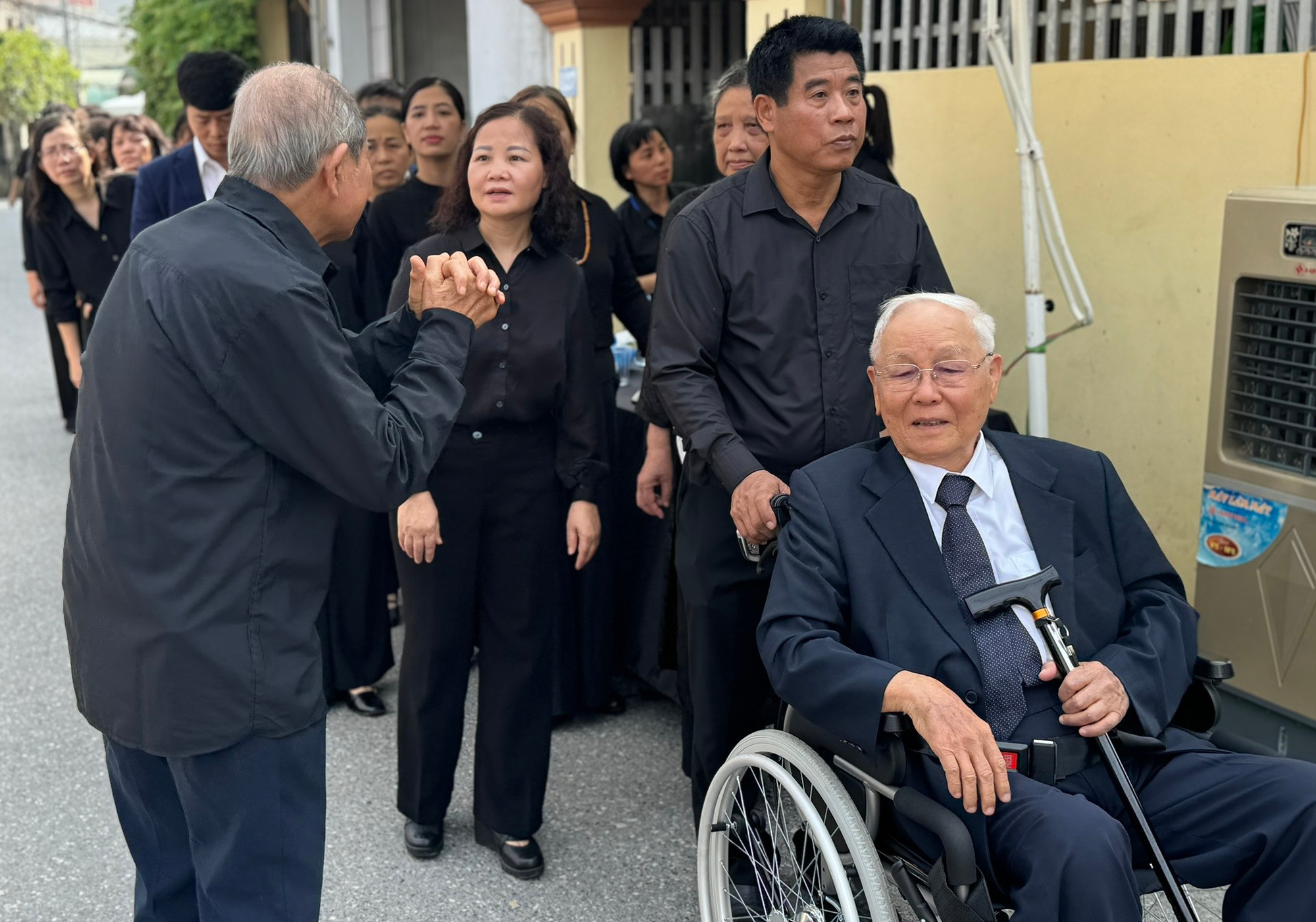 Cô giáo Đặng Thị Phúc (92 tuổi) là người đã dạy Tổng Bí thư Nguyễn Phú Trọng thời tiểu học. Sáng 26/7, cô Phúc được người nhà đẩy xe lăn đưa tới nhà tang lễ để tiễn đưa học trò ưu tú của mình.