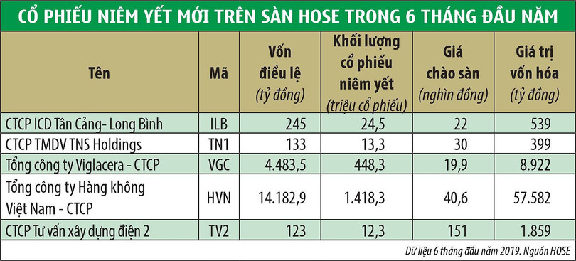 Cùng khoảng thời gian này, trên Sở Giao dịch chứng khoán TP.HCM (HOSE), có 5 doanh nghiệp chính thức được cấp quyết định niêm yết, với tổng khối lượng niêm yết mới đạt 1.916 triệu cổ phiếu, tương ứng giá trị niêm yết theo mệnh giá là 19.167 tỷ đồng.