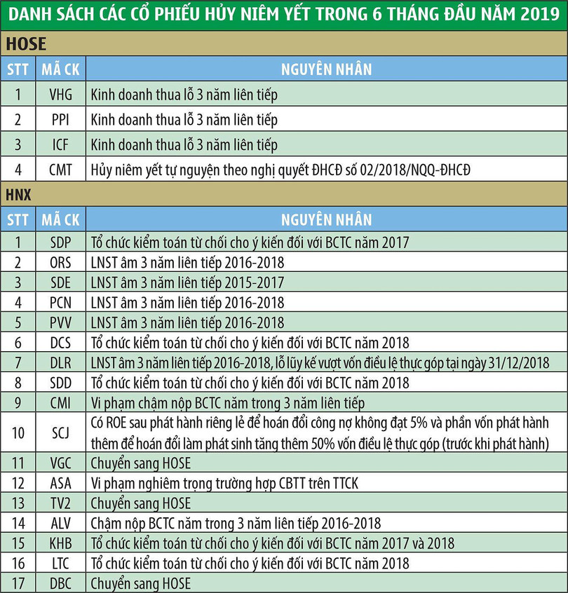 Nhìn vào lý do 16 doanh nghiệp phải rời sàn HNX trong 6 tháng đầu năm nay, sẽ thấy ngoại trừ 2 doanh nghiệp xin hủy niêm yết tự nguyện để chuyển sang sàn HOSE, 14 doanh nghiệp còn lại bị hủy niêm yết bắt buộc với lý do thua lỗ trong 3 năm liên tiếp hoặc vi phạm quy định về công bố thông tin, bị công ty kiểm toán từ chối cho ý kiến với báo cáo tài chính… Trong khi đó, với 4 doanh nghiệp rời sàn HOSE, chỉ có CMT hủy niêm yết tự nguyện, 3 doanh nghiệp còn lại xuất phát từ lý do có 3 năm liên tiếp thua lỗ.