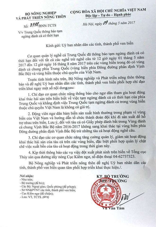 Công văn trên được Thứ Trưởng Bộ NN&PTNN Vũ Văn Tám ký, gửi đến UBND các tỉnh thành phố ven biển về việc phối hợp chỉ đạo ngay một số nội dung về hoạt động khai thác hải sản trên biển trong bối cảnh Trung Quốc thông báo tạm ngừng đánh cá có thời hạn đối với tất cả các nghề trừ nghề câu từ 12 giờ ngày 1.5 đến 12 giờ ngày 16.8.2017 trên các vùng biển, trong đó có vùng đánh cá chung phía Trung Quốc (vùng biển phía Đông đường phân định Vịnh Bắc Bộ) và vùng biển thuộc chủ quyền của Việt Nam.