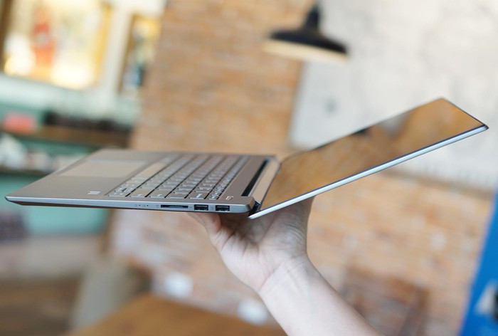Model này trang bị cả cảm biến vân tay, loa Dolby Audio. Trackpad của máy khá lớn, phím bấm có độ sâu vừa phải, trải nghiệm gõ không quá tốt. Máy bán ra từ giữa tháng 6 với giá từ 15 triệu đồng, bao gồm các màu xanh thẫm, vàng đồng và xám kim.