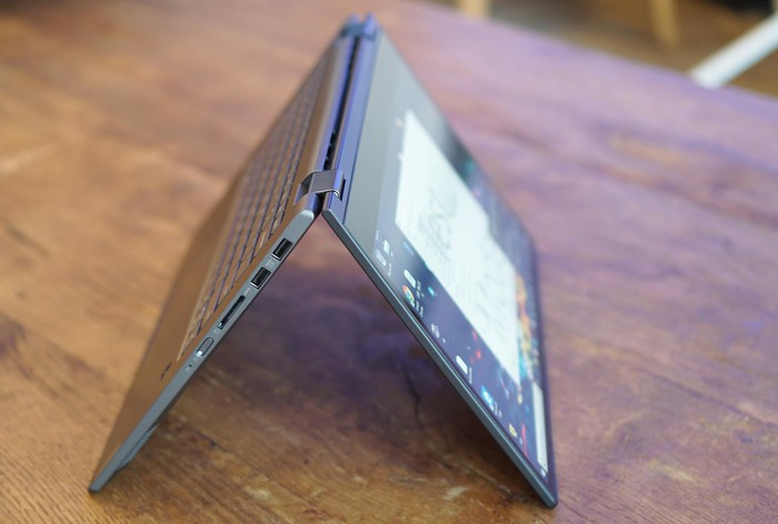 Phần bản lề có thể gập 180 độ. Phần màn hình được làm dày và khá cứng. Một điểm mạnh của model này là khả năng hỗ trợ sạc nhanh RapidCharge, cho khoảng 2 giờ sử dụng sau 15 phút sạc. Máy cũng có thể sạc được 70% sau 1 giờ. Thời lượng sử dụng theo công bố của nhà sản xuất là 12 tiếng.