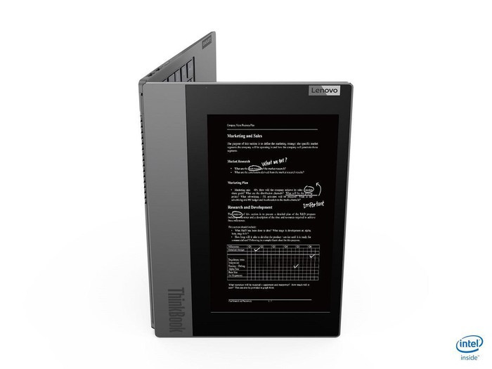 Với bối cảnh khoảng cách của độ khả dụng giữa laptop và smartphone ngày càng gần nhau hơn và lực lượng lao động thế hệ mới thường xuyên sử dụng đa nhiệm trên nhiều thiết bị, Lenovo ra mắt ThinkBook Plus - chiếc laptop có màn hình e-ink ở nắp vỏ máy để nâng cao hiệu suất và sự tập trung trong công việc. Màn hình này có thể được sử dụng để tạo ra các ghi chú và minh họa với bút Precision Pen, đồng thời để hiển thị những thông báo quan trọng khi nắp máy đang đóng. Đây là một dạng laptop mới tích hợp nhiều tính năng sáng tạo giúp người dùng tối đa hóa hiệu quả đa nhiệm của họ.