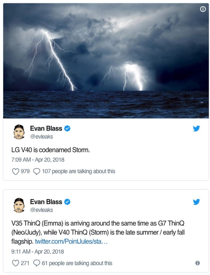 Theo Android Authority, nguồn tin từ Evan Blass (@evleaks) cho biết sản phẩm bí ẩn này chính là LG V40 ThinQ, dự kiến ra mắt vào mùa thu với tên mã "Storm" (bão tố). Tên mã nội bộ hiện tại của LG G7 ThinQ là "Neo/Judy" còn V35 ThinQ là "Emma".