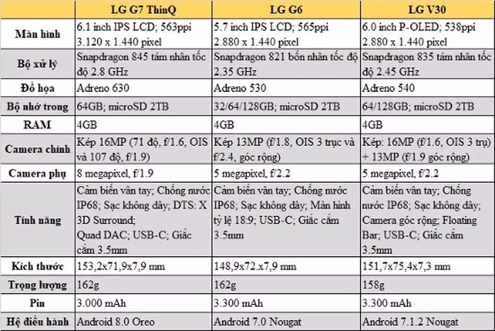 Thực tế giữa LG G7 ThinQ và LG V30 chỉ có kích thước tương tự nhau và là bản nâng cấp nhẹ so với người anh em của mình, nhất là khi kết hợp các thông số kỹ thuật với nhau.