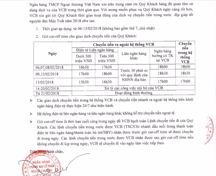 Bên cạnh đó, Vietcombank cũng ra thông báo thời gian hoạt động của dịch vụ chuyển tiền trong nước dịp giáp Tết Nguyên đán 2018 để khách hàng tiện theo dõi và chủ động trong giao dịch