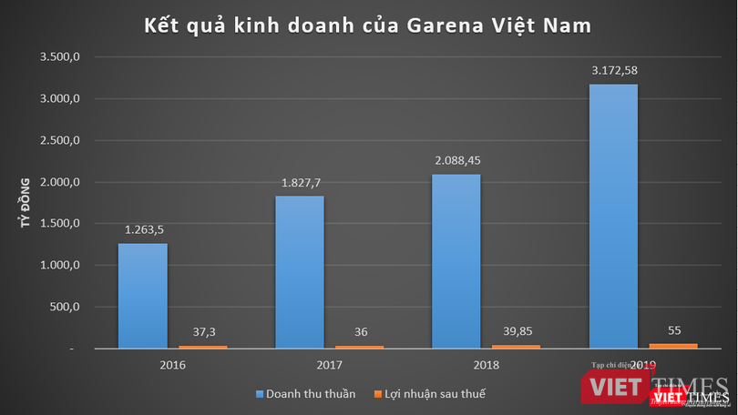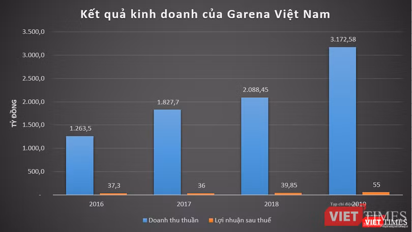 Trong 4 năm trở lại đây, công ty này liên tục tăng trưởng mạnh về doanh thu. Năm 2019, doanh thu thuần của Garena Việt Nam đạt 3.172 tỷ đồng, tăng 52% so với năm trước; lợi nhuận sau thuế ở mức 55 tỷ đồng, tăng 38% so với năm 2018.