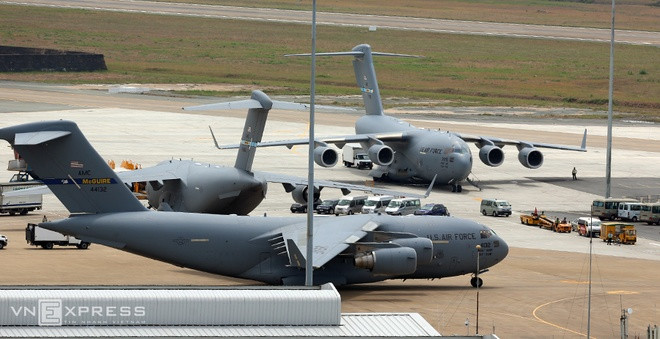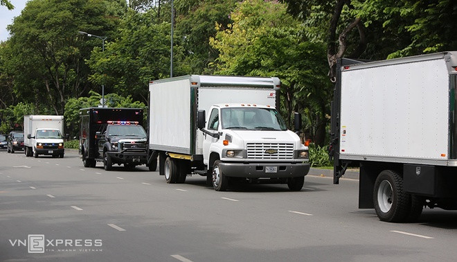 Trong số hàng hoá được chở đến lần này có xe của Tổng thống Mỹ và các xe chuyên dụng khác phục vụ cho chuyến thăm.