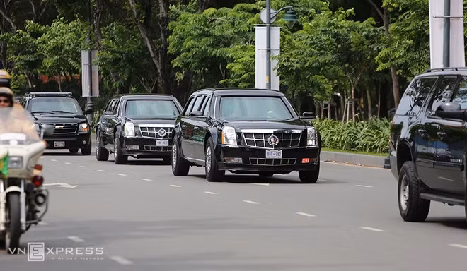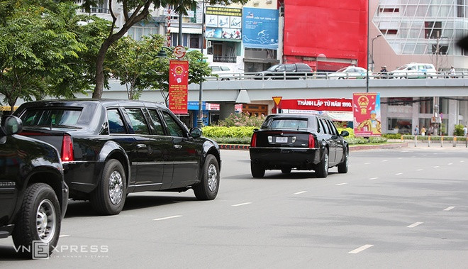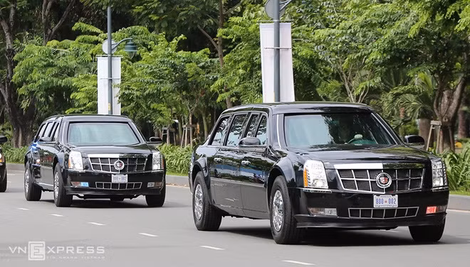 Trong số những chiếc xe của đoàn, có hai chiếc Cadillac One. Hai xe này giống hệt nhau, cùng mang biển số 800-002. Một trong hai xe sẽ chở Tổng thống Obama khi ông di chuyển trên đường.