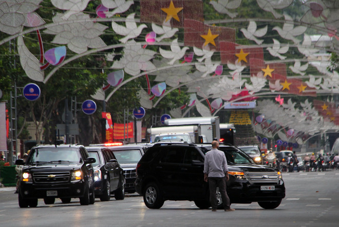 Dàn xe phục vụ chuyến viếng thăm của ông Obama. Sau khoảng bốn giờ đậu tại sân bay, đoàn xe bắt đầu di chuyển vào trung tâm TP HCM.