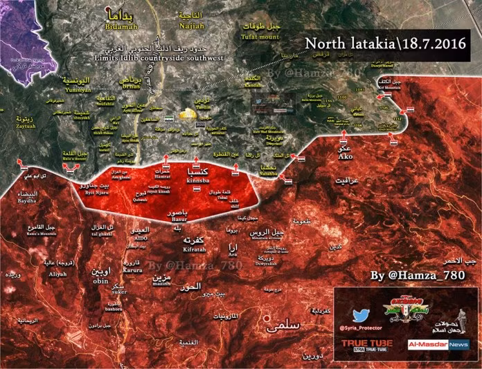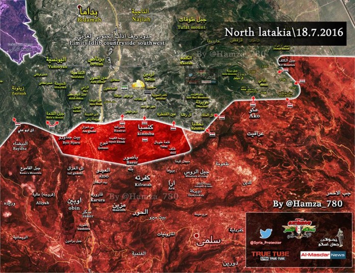 Phóng viên chiến trường Al MasdarNews tại khu vực Jabal Al-Akrad cho biết: các lực lượng vũ trang Syria đánh chiếm cao điểm Tal Qal'at sau trận chiến đánh bại lực lượng Hồi giáo cực đoan Jaysh Al-Fateh (Quân đội Chinh phục) được Thổ Nhĩ Kỳ hậu thuẫn gần thị trấn chiến lược Kinsibba.
