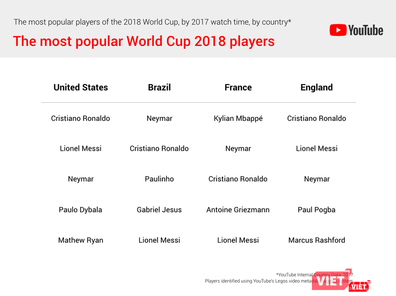 Những video của các ngôi sao bóng đá, gồm có Lionel Messi, Neymar da Silva Santos Jr. (Neymar), và Cristiano Ronaldo, đều có thời gian xem tăng mạnh lên đến 80% vào năm trước (so với năm trước đó).