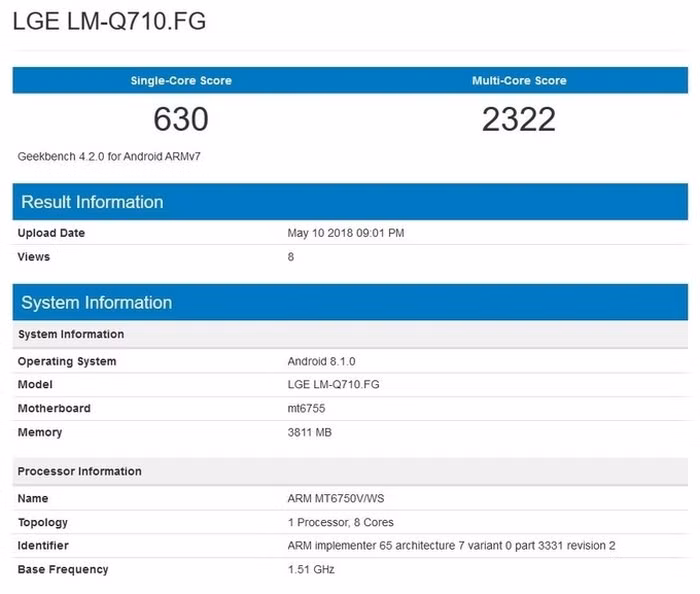 Theo PhoneArena, thay vì dùng vi xử lý Snapdragon 435 như LG Q6, LG Q7 trên Geekbench được ghi nhận sử dụng MediaTek Helio P10 với 8 nhân 1.5GHz cùng 4GB RAM, cho điểm đơn nhân là 630 và đa nhân là 2.322. Do là máy mới nên Q7 gần như chắc chắn sẽ chạy Android 8.1 Oreo. Dù chưa có ảnh rò rỉ nhưng giới thạo tin dự đoán LG Q7 sẽ có thiết kế giống G7 ThinQ với màn hình tỉ lệ dài và tai thỏ.