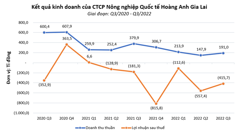 Trừ đi giá vốn hàng bán (373,1 tỉ đồng), chi phí tài chính (223,3 tỉ đồng), chi phí bán hàng (6 tỉ đồng), chi phí quản lý doanh nghiệp (14,1 tỉ đồng) và các loại chi phí khác, HNG báo lỗ sau thuế quý 3/2022 ở mức 415,7 tỉ đồng.