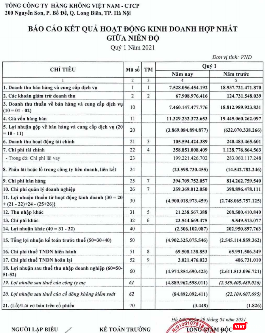Tuy nhiên, do tốc độ giảm doanh thu cao hơn tốc độ giảm chi phí nên lợi nhuận sau thuế của công ty mẹ giảm trên 2.793 tỉ đồng. Lũy kế 3 tháng đầu năm 2021, Vietnam Airlines báo lỗ sau thuế gần 4.975 tỉ đồng, lỗ sau thuế của công ty mẹ là gần 4.890 tỉ đồng.