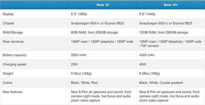 Thông số kỹ thuật của Galaxy Note10 và Note10+. Ảnh: Techmaniacs.