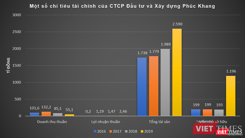 Theo đó, tính đến ngày 31/12/2019, tổng tài sản của Phúc Khang Corporation đạt 2.590 tỉ đồng, tăng 30% so với thời điểm đầu năm; vốn chủ sở hữu tăng gấp hơn 6 lần lên mức 1.196 tỉ đồng.