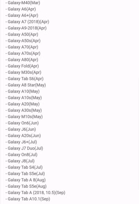 Dưới đây là danh sách các mẫu điện thoại và máy tính bảng của Samsung sẽ được cập nhật lên Android 10: