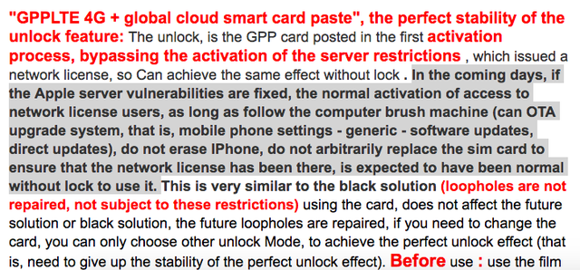 Thực chất, đây không phải là phỏng đoán của cá nhân anh Hà Phùng, mà thậm chí là cả từ chính nhà sản xuất SIM ghép. Ngay trên trang chủ của GPPLTE Trung Quốc (một thương hiệu SIM ghép khá phổ biến trên thị trường), hãng này đã khẳng định SIM ghép 4G sử dụng phương pháp giúp vượt qua rào cản của máy chủ kích hoạt Apple, tuy nhiên hoàn toàn có thể bị khóa "trong những ngày tới".