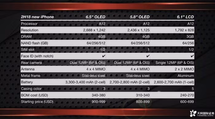 Về cấu hình, iPhone OLED dự kiến trang bị camera kép 12MP như iPhone X, khung thép không gỉ, modem Intel LTE nhanh hơn hỗ trợ 4x4 MIMO, RAM 4GB, bộ nhớ tối đa 512GB. Trong khi đó, iPhone LCD được dự đoán sử dụng khung nhôm, camera 1 ống kính duy nhất, pin 2.600 đến 2.700mAh, bộ nhớ tối đa 256GB, modem Intel LTE hỗ trợ 2x2 MIMO, RAM 3GB, không hỗ trợ 3D Touch.