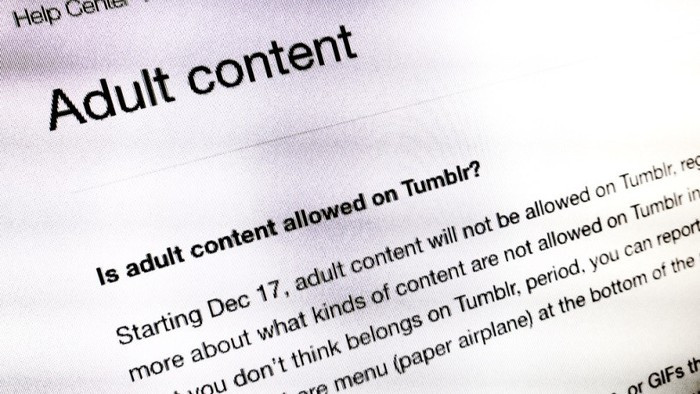 Bắt đầu từ 17/12, Tumblr buộc người dùng tuân thủ chính sách mới cấm đăng tải và lan truyền nội dung người lớn từ hình ảnh, video, gif. Những tài khoản bị phát hiện những nội dung trên sẽ phải chuyển sang chế độ riêng tư, chỉ được xem bởi người sở hữu.