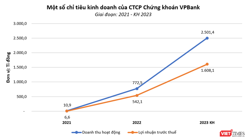 Theo đó, năm 2023, VPBank Securities lên kế hoạch tổng doanh thu 2.501,4 tỉ đồng, gấp 3,2 lần so với năm trước. Mục tiêu lợi nhuận trước thuế tăng gấp 2,8 lần so với cùng kỳ lên 1.608,1 tỉ đồng.