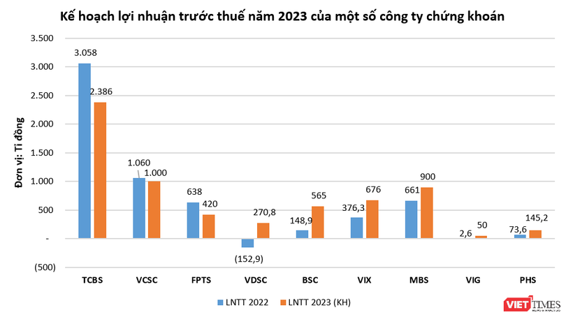 Trước đó, hai công ty chứng khoán khác cũng công bố kế hoạch kinh doanh năm 2023 với lợi nhuận trên mức nghìn tỉ đồng, cụ thể là CTCP Chứng khoán Kỹ Thương (TCBS) và CTCP Chứng khoán Bản Việt (VCSC).