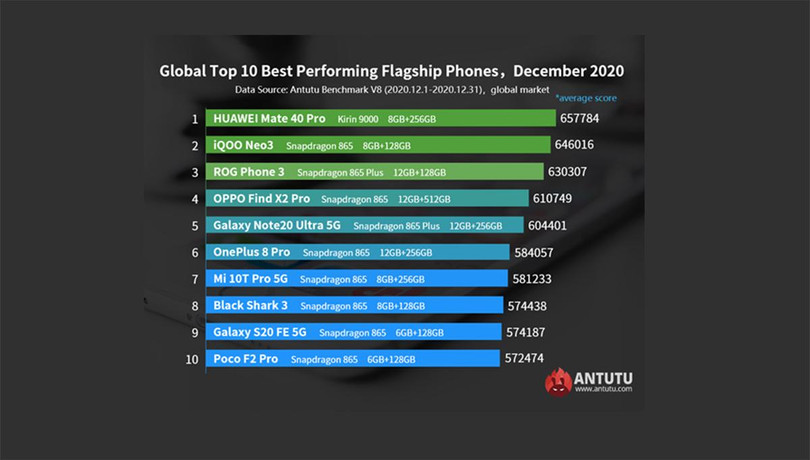 Bảng xếp hạng 10 smartphone mạnh nhất tính đến hết tháng 12/2020 của AnTuTu Benchmark.