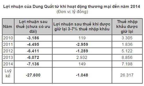 Tuy nhiên, khoản ưu đãi giữ lại thuế nhập khẩu đã giúp gánh bớt lỗ cho Dung Quất, khi đơn vị này chỉ còn lỗ 1.300-3.000 tỷ đồng vào năm 2011 và 2012, trước khi hạch toán lãi gần 3.000 tỷ vào năm 2013 nhờ được giữ lại tới 8.856 tỷ đồng.