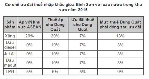 Đầu năm 2016, theo Hiệp định Thương mại hàng hóa ASEAN (ATIGA), thuế nhập khẩu với diesel, nhiên liệu bay Jet A1 về 0% trong khi của Dung Quất là 10%. Doanh nghiệp cho rằng mình thua thiệt, không thể cạnh tranh được với hàng nhập do thuế cao hơn.