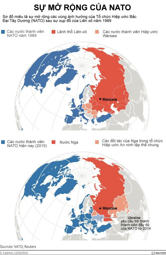 Sự nghi ngờ của V. Putin đối với NATO có thể được giải thích bằng một ví dụ đơn giản: sơ đồ. Trong thời điểm cao trào của Chiến tranh Lạnh và sức mạnh của Liên bang Xô viết. Liên xô với các nước đồng minh. Khối Hiệp ước Warsaw chiếm một lãnh thổ bằng một nửa Châu Âu và gần như toàn bộ khu vực Trung Á. Nhưng sau sự sụp đổ của Liên xô vào năm 1989, những vùng đất này nhanh chóng rời bỏ quỹ đạo của Moscow và gia nhập liên minh NATO. Cho đến này, chỉ còn lại Belarus vẫn chắc chắn trong vùng ảnh hưởng của Moscow, ngay cả có những lúc quan hệ đối tác trở nên rất bấp bênh.
