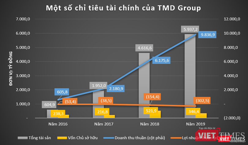 Doanh thu thuần tăng trưởng là vậy, song TMD Group lại liên tục báo lỗ, số lỗ qua các năm càng lớn. Như năm 2019, TMD Group báo lỗ 302,5 tỉ đồng, cao gần gấp 2 lần so với năm 2018. Khoản lỗ này kéo quy mô vốn chủ sở hữu của TMD Group từ mức 521,9 tỉ đồng (cuối năm 2018) xuống chỉ còn 346,4 tỉ đồng vào cuối năm 2019. Hay nói cách khác, TMD Group càng làm càng lỗ.