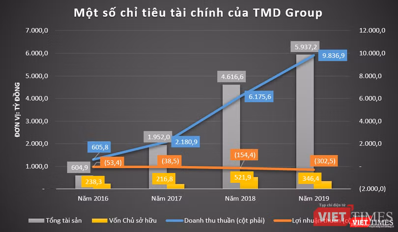 Cụ thể, doanh thu thuần của TMD Group năm 2016 chỉ đạt 605,8 tỉ đồng thì năm 2017 đã tăng lên gấp 3,6 lần, đạt mức 2.180,9 tỉ đồng. Năm 2018, doanh thu của TMD Group đạt 6.175,6 tỉ đồng, cao gấp 2,8 lần so với năm 2017. Còn trong năm ngoái, TMD Group ghi nhận doanh thu thuần đạt 9.836,9 tỉ đồng, tăng gấp rưỡi so với năm 2018.