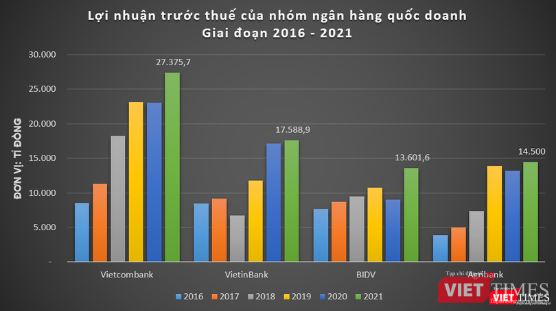 Như vậy, tổng lợi nhuận trước thuế năm 2021 của 4 ngân hàng thương mại quốc doanh (Vietcombank, VietinBank, BIDV và Agribank) là hơn 73.066 tỉ đồng, tăng khoảng 17% so với năm 2020./.