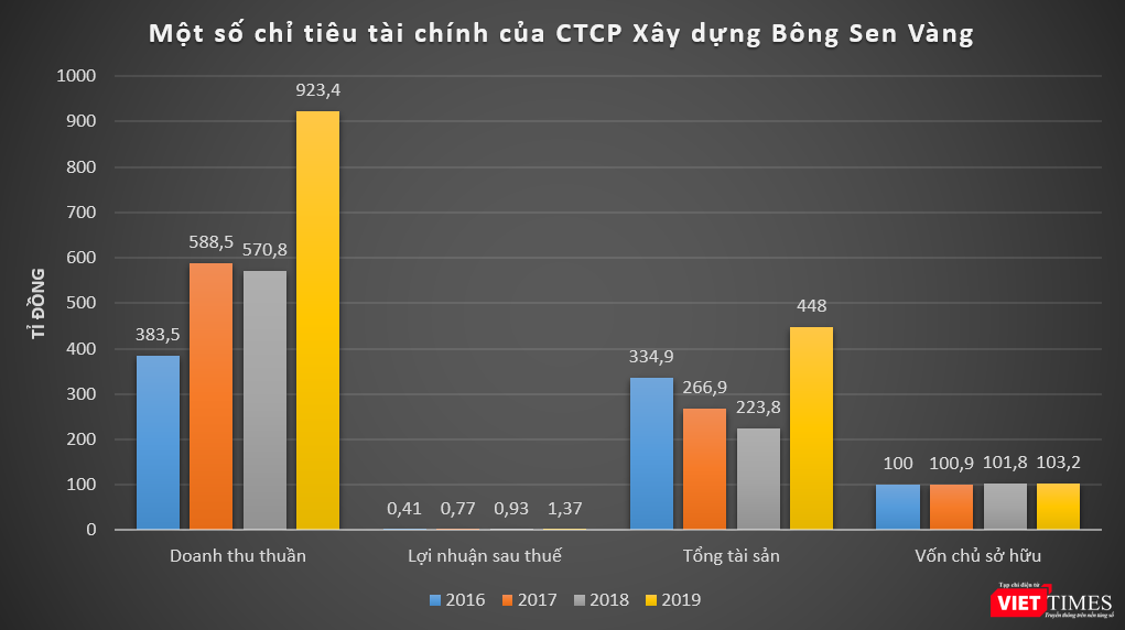 Trúng các gói thầu xây dựng lớn, dữ liệu của VietTimes cho thấy, doanh thu của Bông Sen Vàng cũng tăng trưởng mạnh trong nhiều năm. Cụ thể, giai đoạn 2016 - 2019, doanh thu thuần của Bông Sen Vàng đã tăng gấp 2,4 lần, từ 383,5 tỉ đồng năm 2016 lên 923,4 tỉ đồng năm 2019.